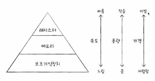 - 속도가 빠른 저장 장치는 저장 용량이 작고, 가격이 비싸다.
