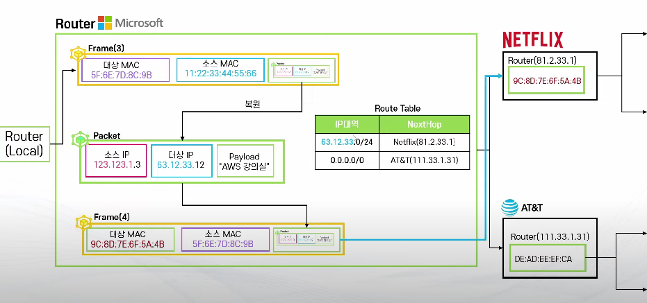 - 이후 Router는 패킷을 Frame 안에 넣어서 최적 경로에 따른 다른 Router 로 전달