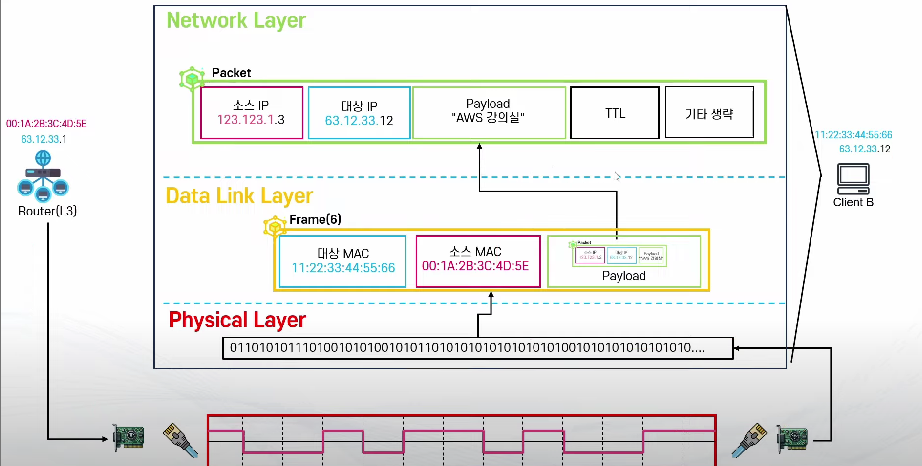 - 이후 Router는 패킷을 Frame 안에 넣어서 최적 경로에 따른 다른 Router 로 전달