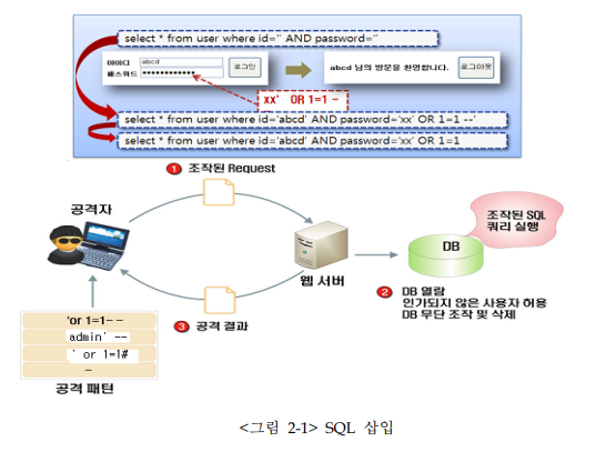 공격자가 입력 폼 및 URL 입력란에 SQL 문을 삽입하여 DB로부터 정보를 열람하거나 조작할 수 있는 보안약점을 말한다.