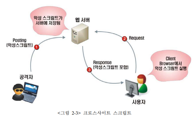 웹 페이지에 악의적인 스크립트를 포함시켜 사용자 측에서 실행되게 유도하여 공격