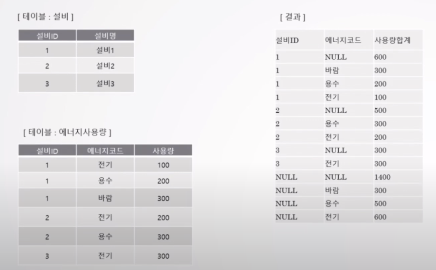 GROUP BY CUBE(a.설비id, b.에너지코드)